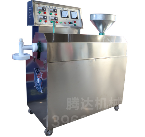 将淀粉和水比例调浆后送入粉条机进料口内通过螺旋推进装置将粉推进粉条漏板漏出,采用水蒸汽原理,双层水箱,给水加热,蒸煮粉条机内管,使粉条在螺旋推进当中得到成熟。采用独有的双螺旋更利于粉条粉丝的熟化,粉条在成形过程中经 100 度沸水煮熟,与手工制粉条的原理相同,没有破坏粉条粉丝的分子结构,所以与手工工艺相似.粉条机加工粉条比原手工节省人力.物力。大大的减少了淀粉的浪费.一斤淀粉可以加工一斤一两左右的粉条粉丝(原手工加工为一斤淀粉7-8两左右的粉丝)。